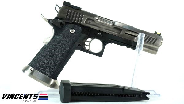 WE 5.1 T-Rex Black Body/Silver Slide With Auto is a gas blowback airsoft pistol with a semi and full-auto firing function. It is the latest generation of hi-capa guns.