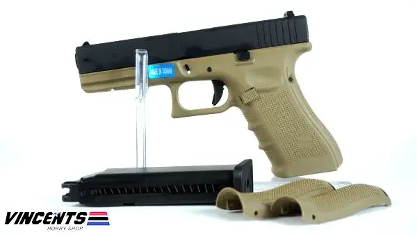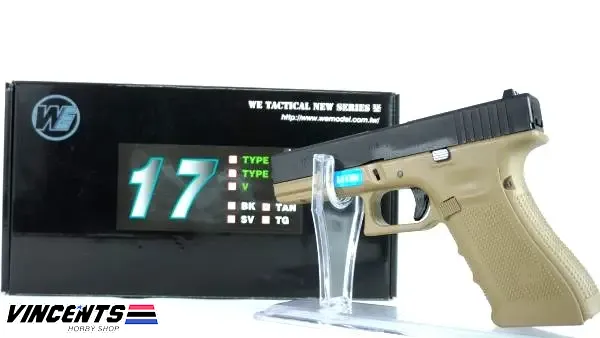 WE Glock 17 Gen 4 Tan Body Black Slide is a gas blowback airsoft pistol. It is a full-size version of G-force with a semi-auto firing function.