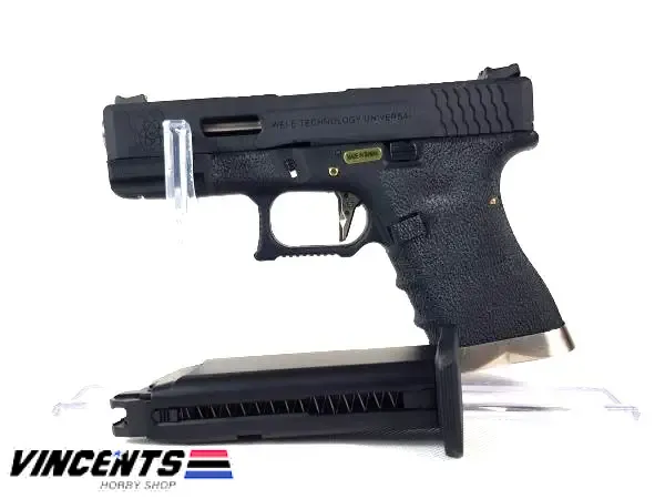 WE Glock 19 TMSS Black is a gas blowback airsoft gun with a semi-auto firing function. It is a high professional airsoft pistol with a standard rail for optic attachments.