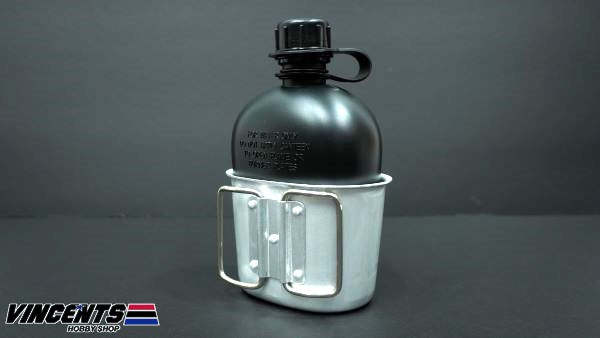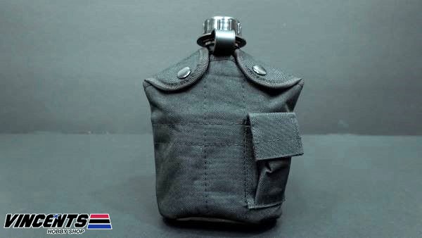 Water Canteen Black is a 250ml reusable water drinking bottle with holster for belt attachment.