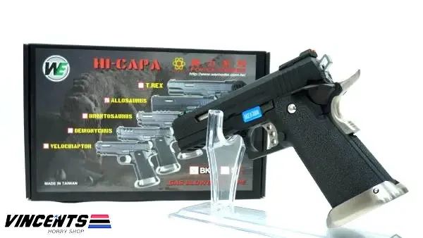 WE 4.3 Allosaurus Black with Auto is a green gas operated. This pistol is good to use for battle because of the high-capacity magazine. It comes out with a semi and full auto function.