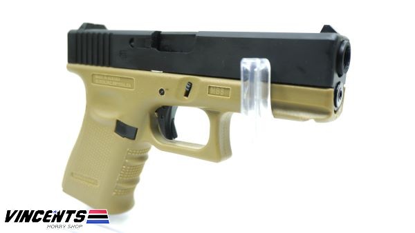 EC 1306 LDE Glock 19 Gen 3 Tan/Black Slide is a gas blowback airsoft gun with a semi-auto firing function. Best used as a backup weapon in a close-quarter battle.