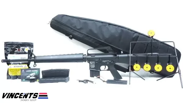 Package Bundles 077 – Double Belle 085 M16A1 Vietnam is one of the newest and a value for money package bundle. It is an awesome treat for airsoft beginner, enthusiasts & even airsoft professionals. Everything you need to start playing airsoft PLUS extras. The rifle of your choice comes with 2 pcs spare magazines, .20 JER BBs, 9.6v stock battery and charger, a red laser, 90 cm gun bag with 3 pcs FYT standing metal target.