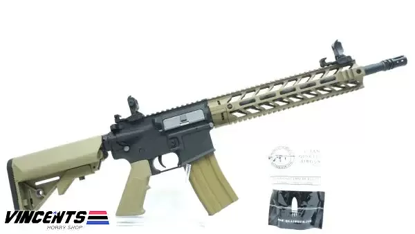 Delta 027s HT AR-15 Two Tone: Black and Tan is an electric airsoft rifle with a metal magazine and retractable butt stock. It is great for close-quarter battles and outdoor games.